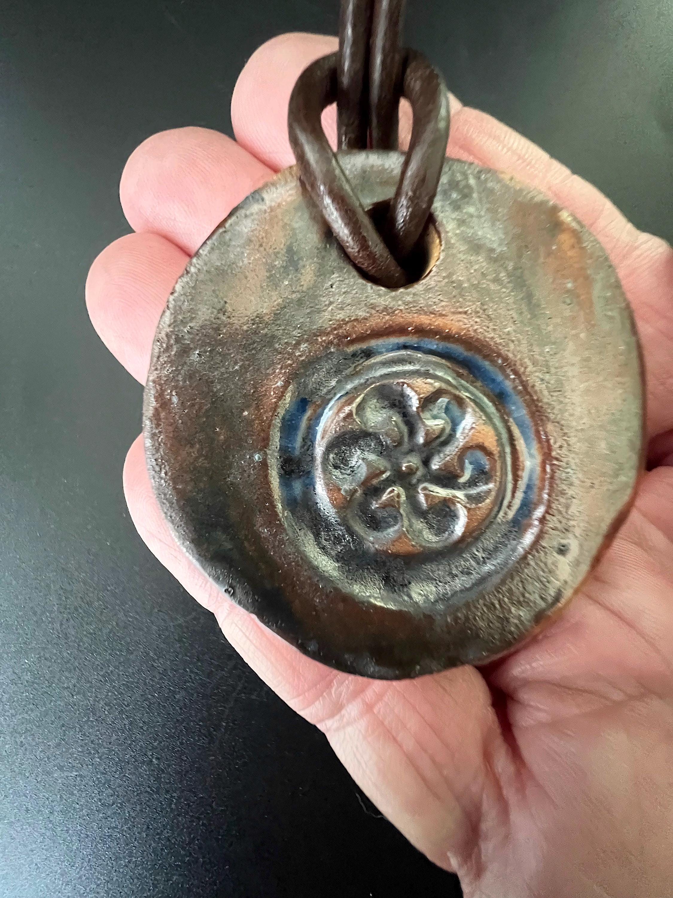 Unique handmade BOHO pendant necklace with stoneware amulet or talisman. Amulets protect from evil, talismans bring good luck. You can decide what this one does for you! Pendant measures about 1 3/4 inches across by 1/4 inch thick. Leather cord is just over 30 inches over all so the pendant will sit just below the middle of your chest. Can be made shorter by re-tying the cord.