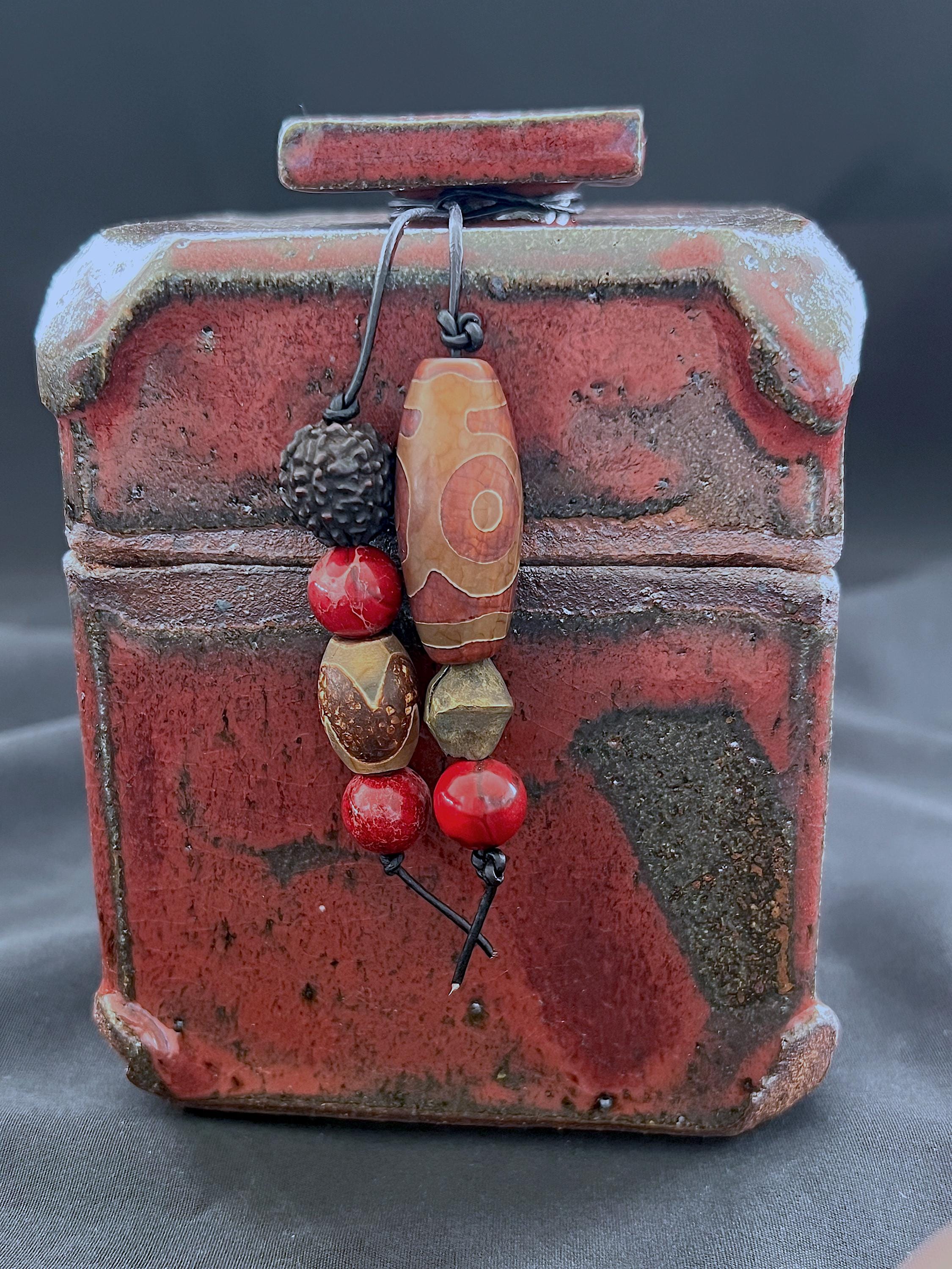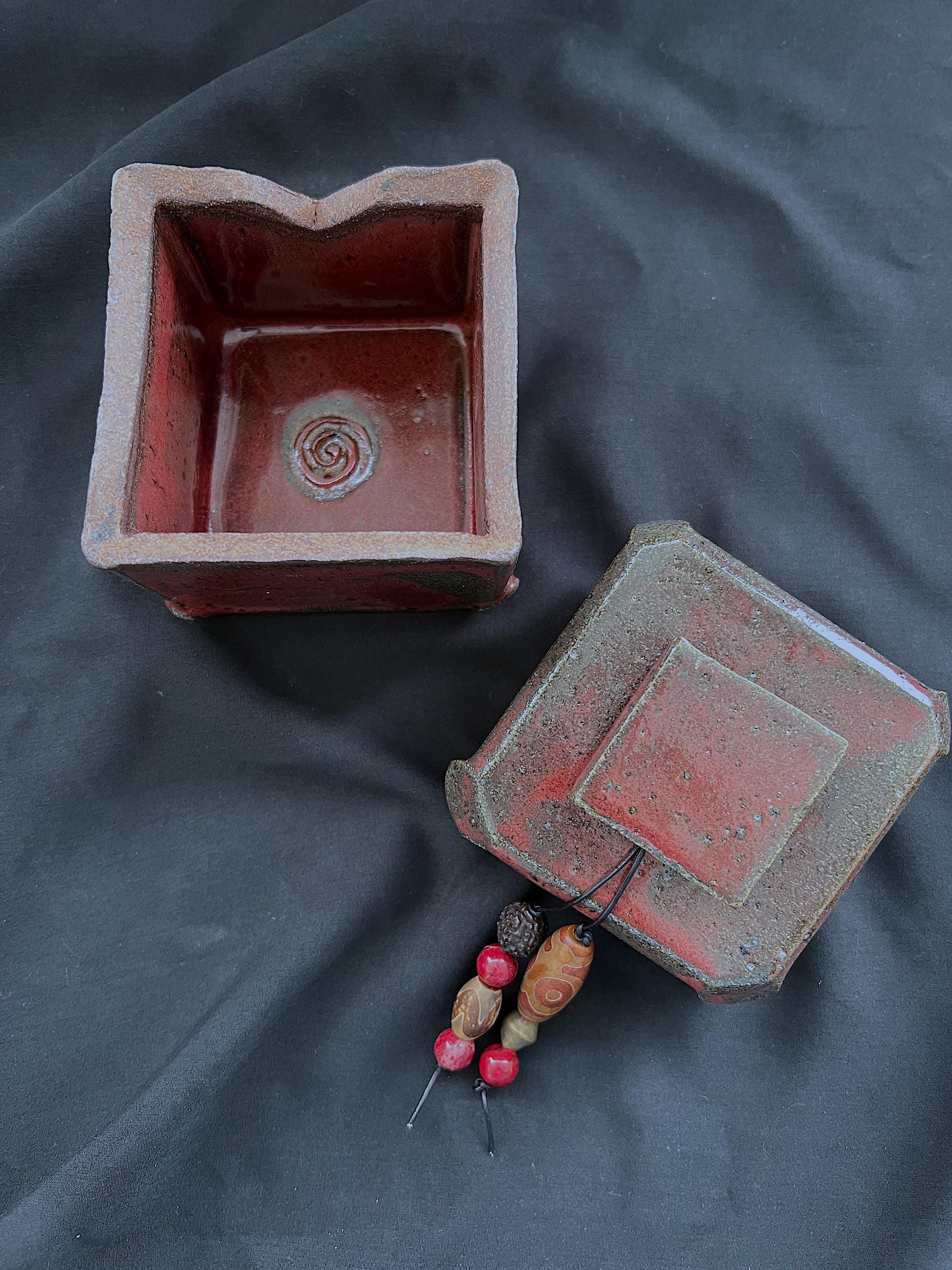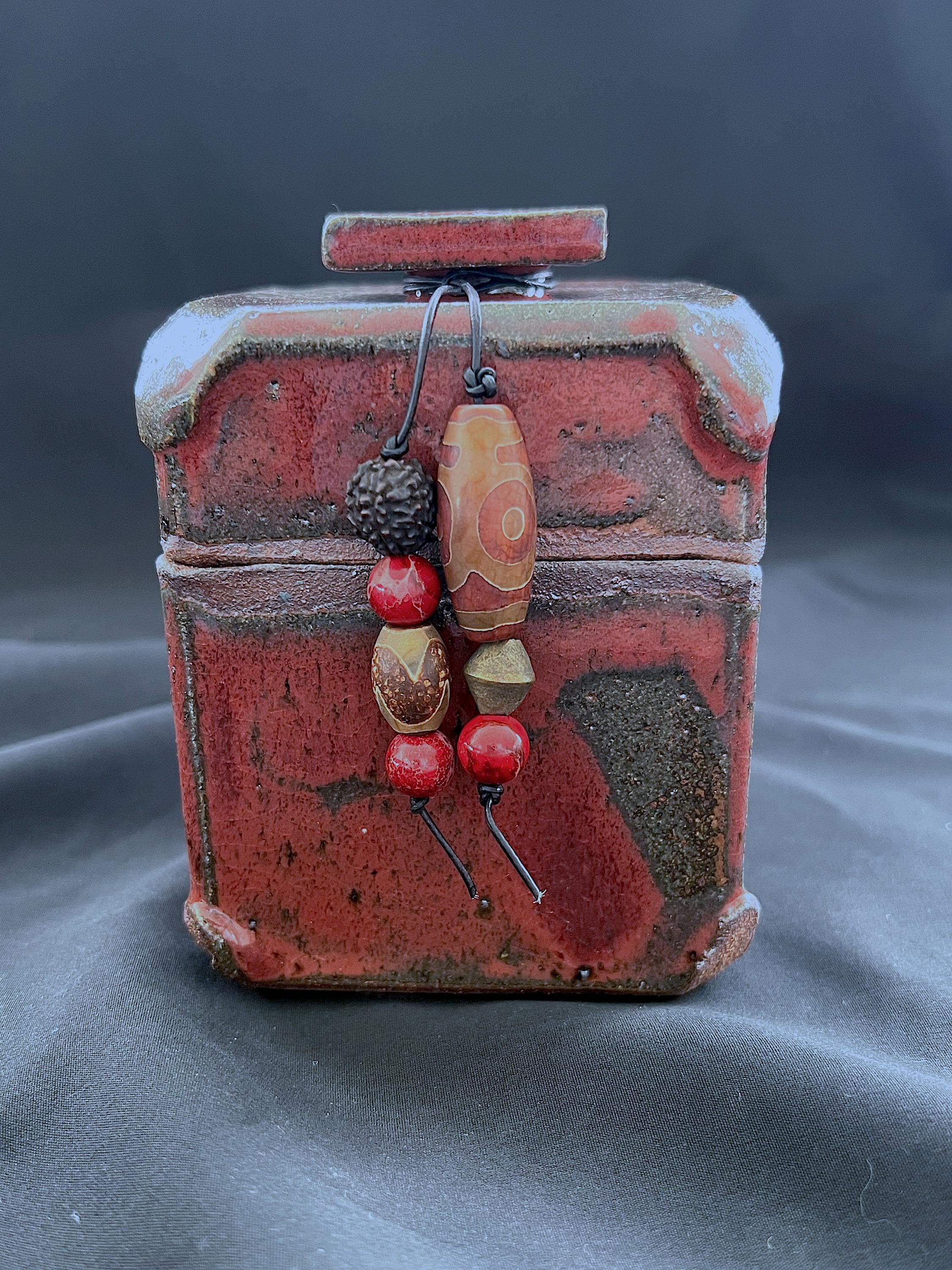 Handmade stoneware ceramic box accented with a collection of ethnic beads. Deep red glaze. Box is slab constructed. It measures about 3.25 inches by 3.25 inches by 4.5 inches tall. Highlighted with the following beads:
