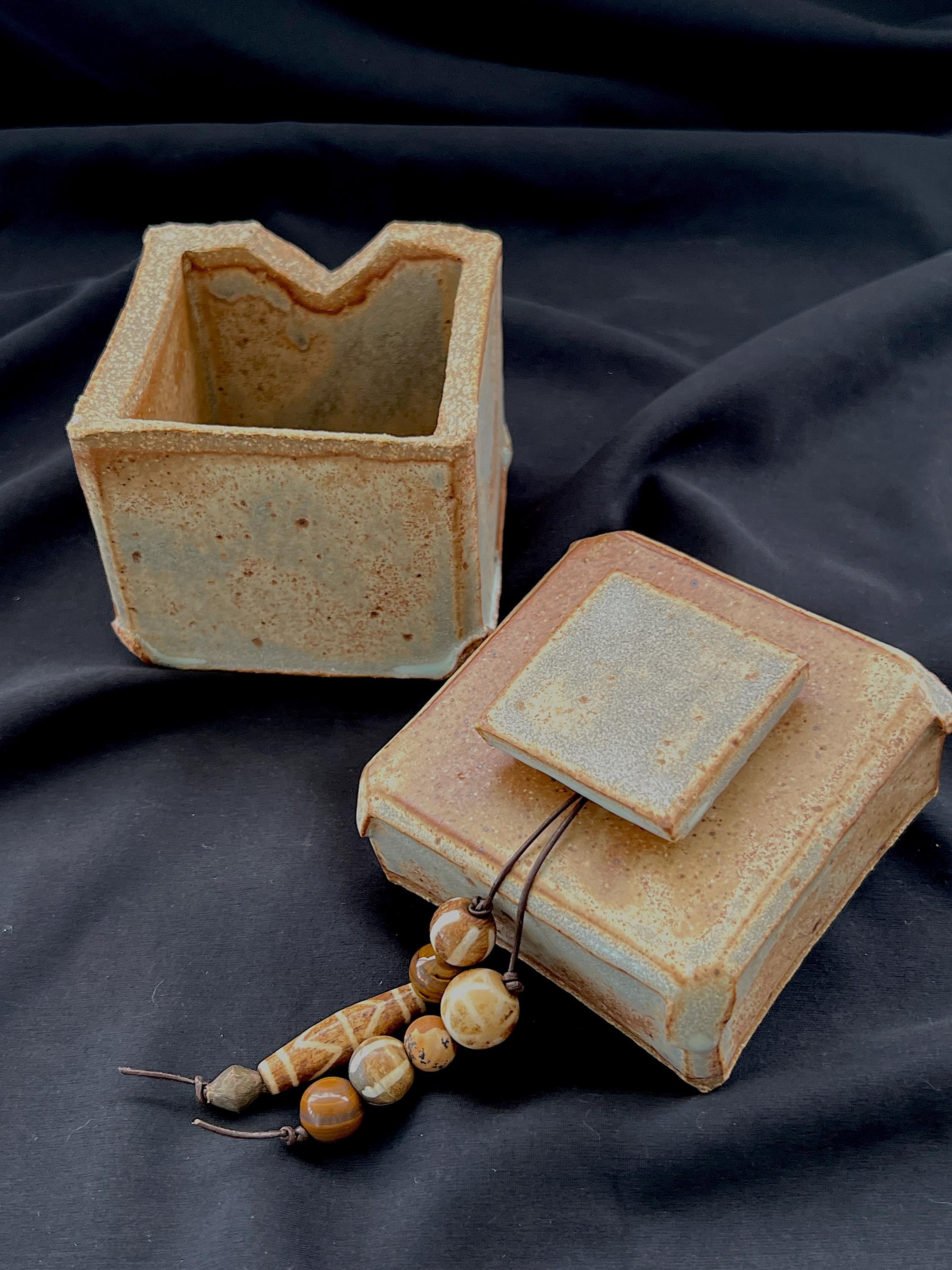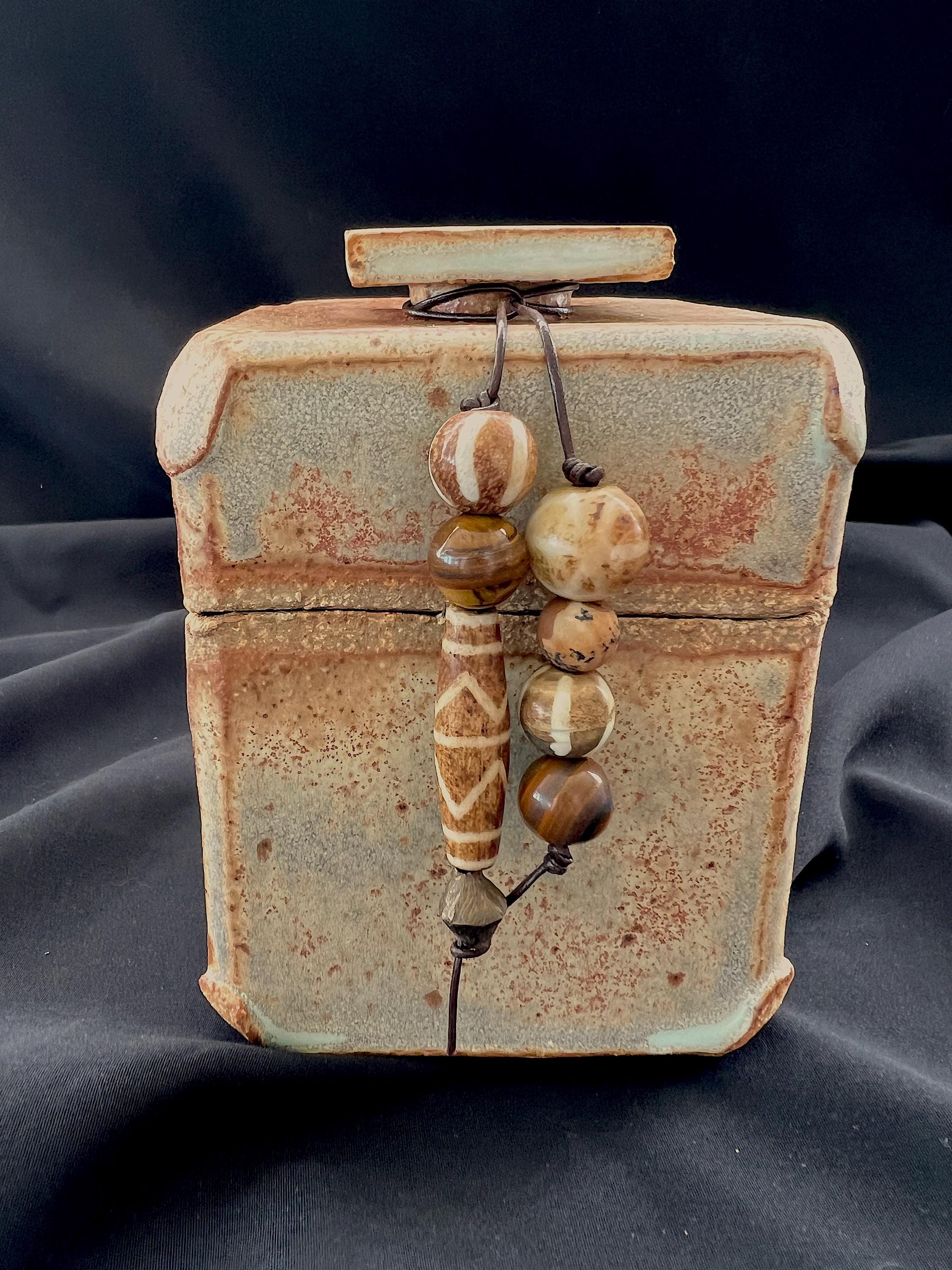 Handmade stoneware ceramic box accented with a collection of ethnic beads. Cream gray glaze with brown. Box is slab constructed. It measures about 3.25 inches by 3.25 inches by 4.5 inches tall. Highlighted with the following beads: