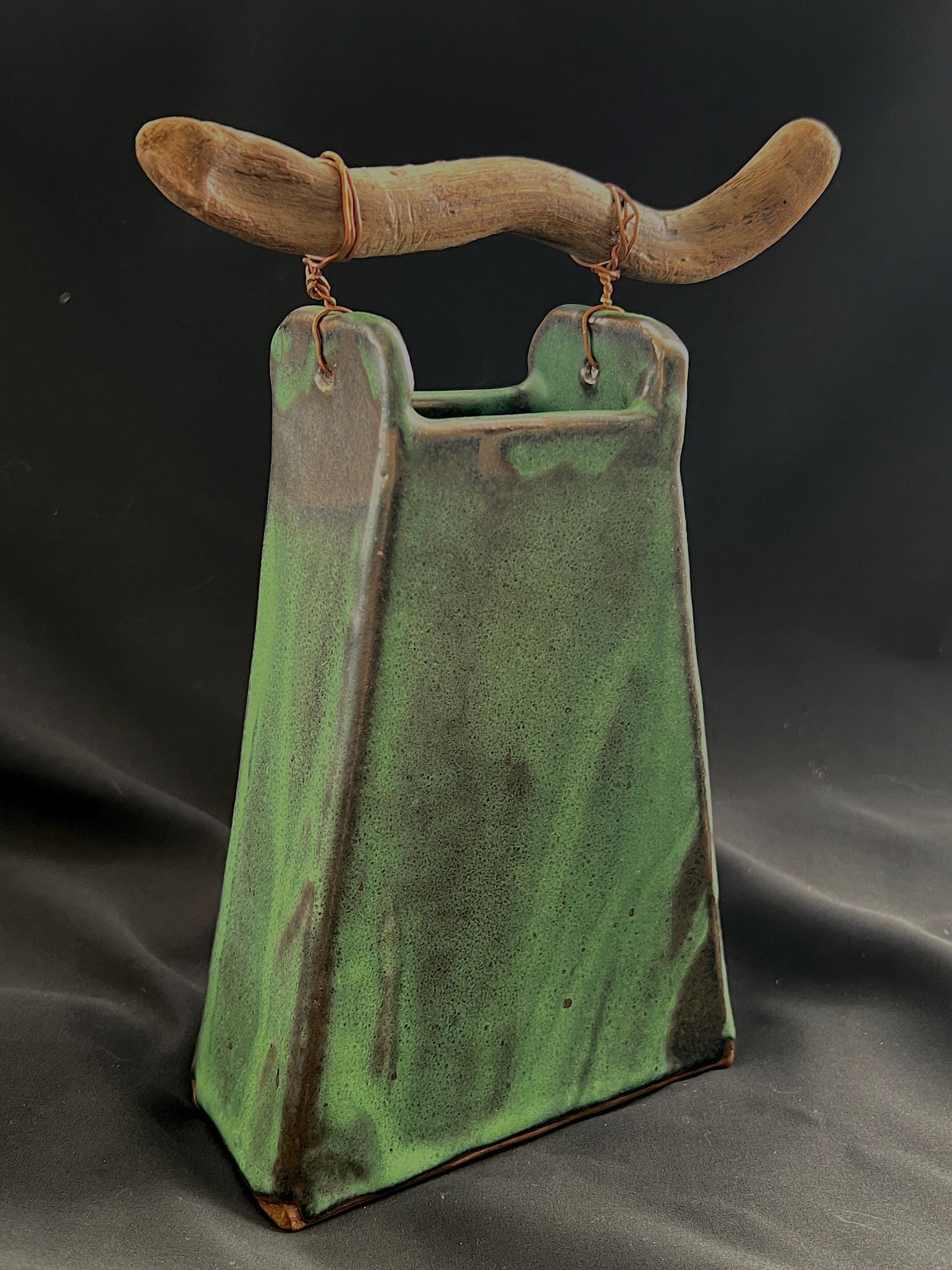 Rustic handmade stoneware vase with driftwood. Slab constructed. Reitz green glaze. Measures about 5 inches by 2 inches at the base, and is about 8 inches tall to top of base, about 9 1/2 inches tall to top of the driftwood. Driftwood piece is about 7 inches long. Driftwood has been polyurethaned but vase should be carefully hand washed.