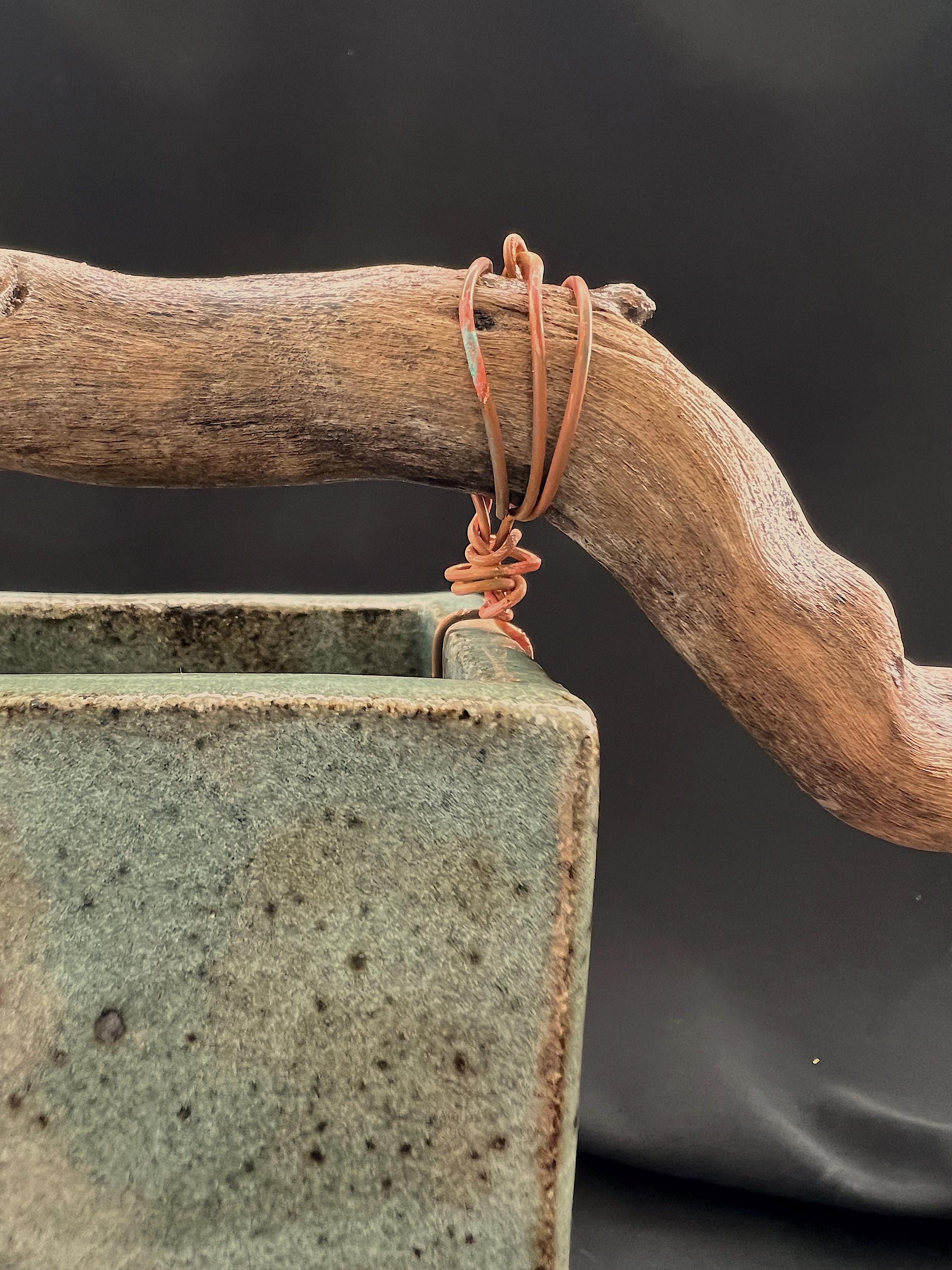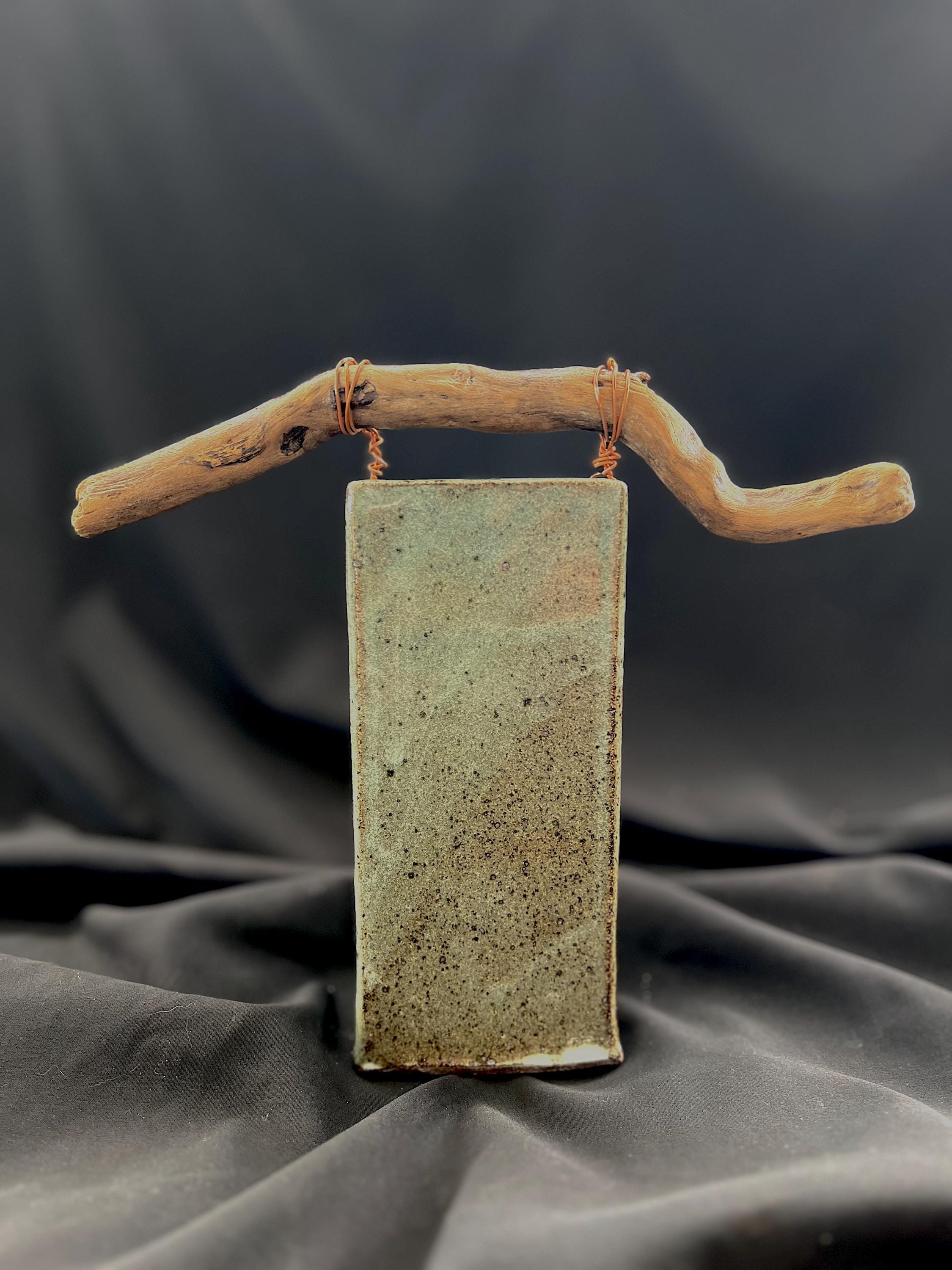 Rustic handmade stoneware vase with driftwood. Slab constructed. Celadon green glaze. Measures about 3 inches by 2 inches at the base, and is about 7 inches tall to top of base, about 8 1/2 inches tall to top of the driftwood. Driftwood piece is about 10 inches long. Driftwood has been polyurethaned but vase should be carefully hand washed.