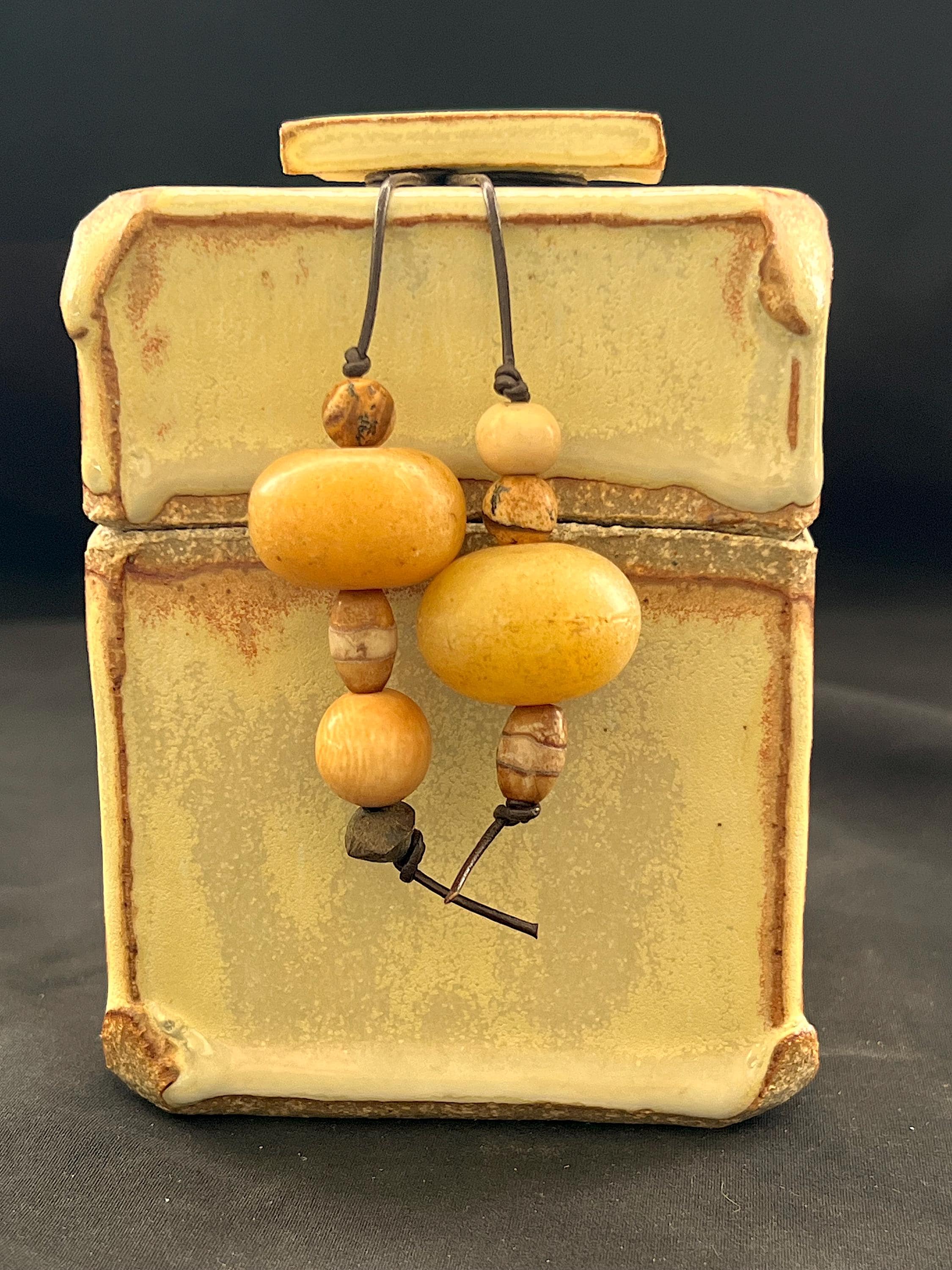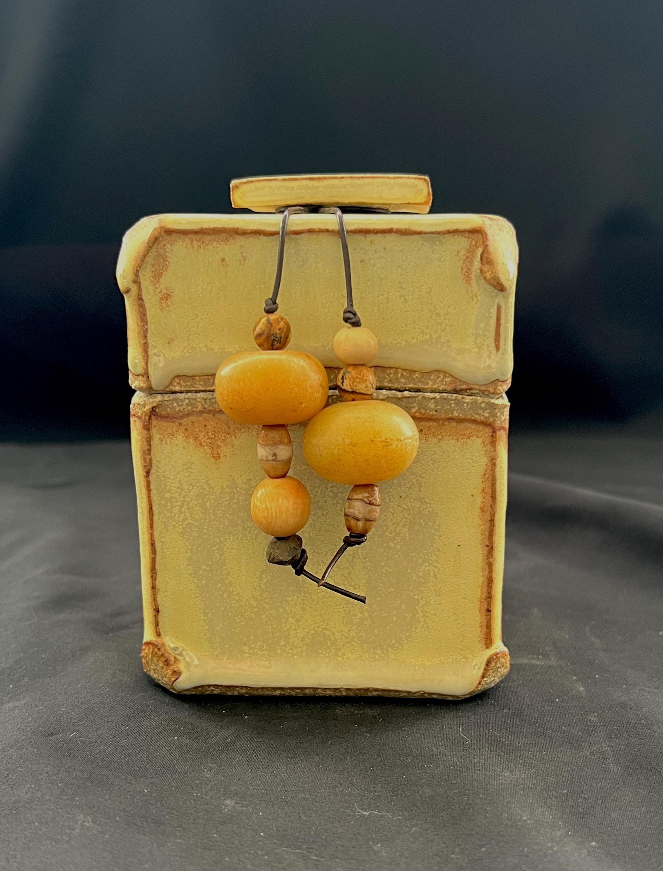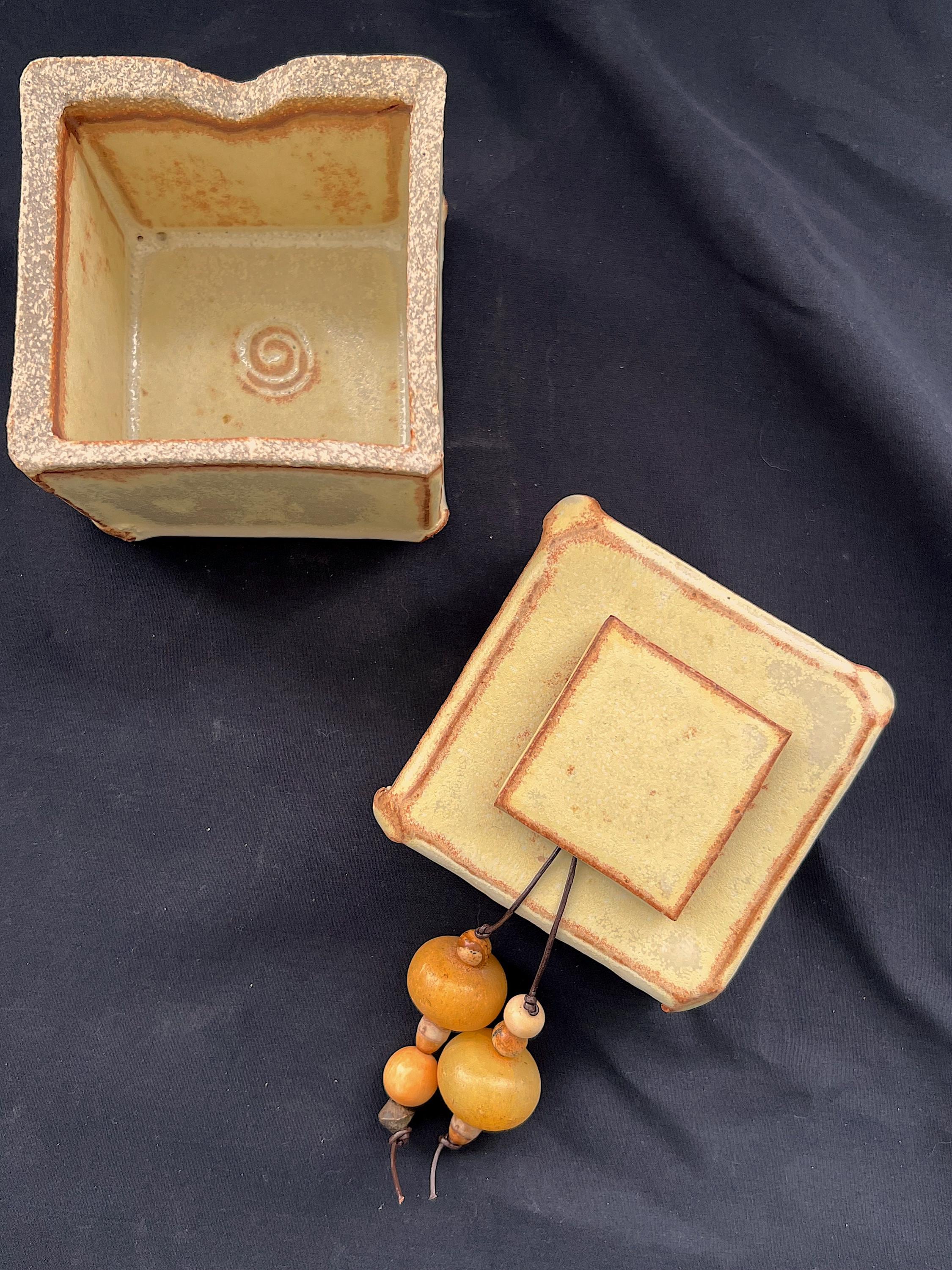 Handmade stoneware ceramic box accented with a collection of ethnic beads. Cream glaze with brown accents. Box is slab constructed. It measures about 3.25 inches by 3.25 inches by 4.5 inches tall. Highlighted with the following beads: