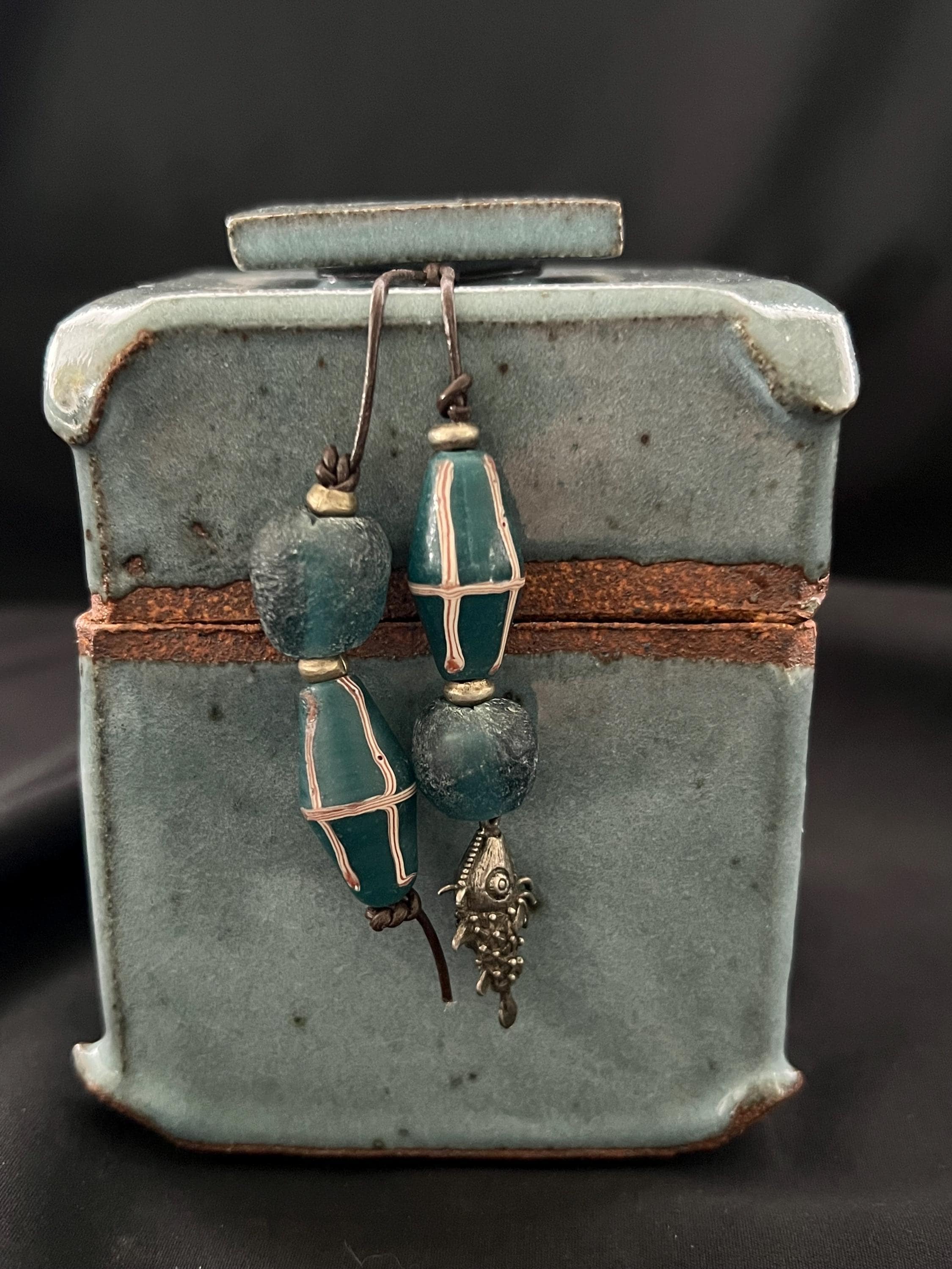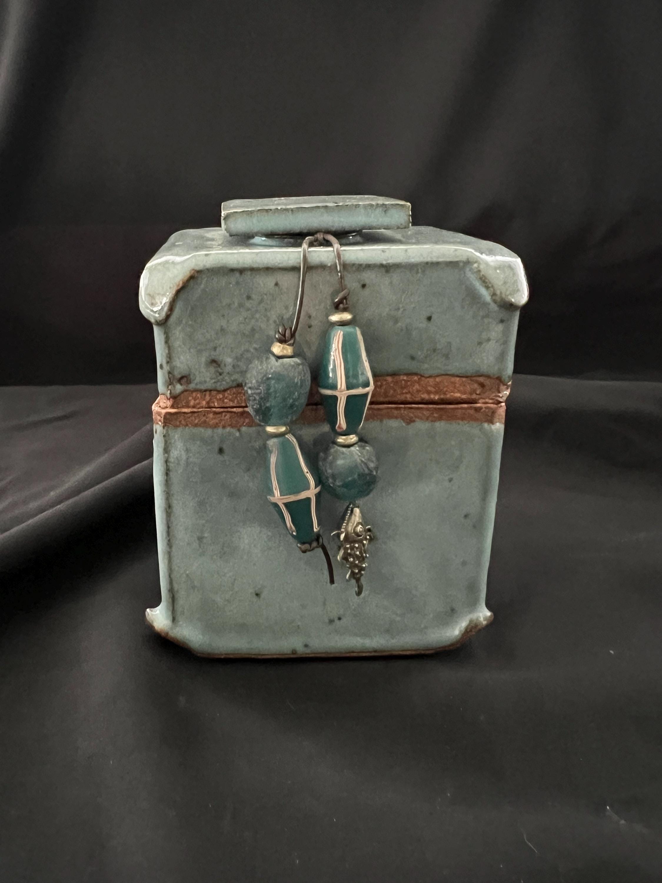 Handmade stoneware ceramic box accented with a collection of ethnic beads. Denim blue glaze. Glaze is slightly darker than the photos. Box is slab constructed. It measures about 3.25 inches by 3.25 inches by 4.5 inches tall. Highlighted with the following beads: