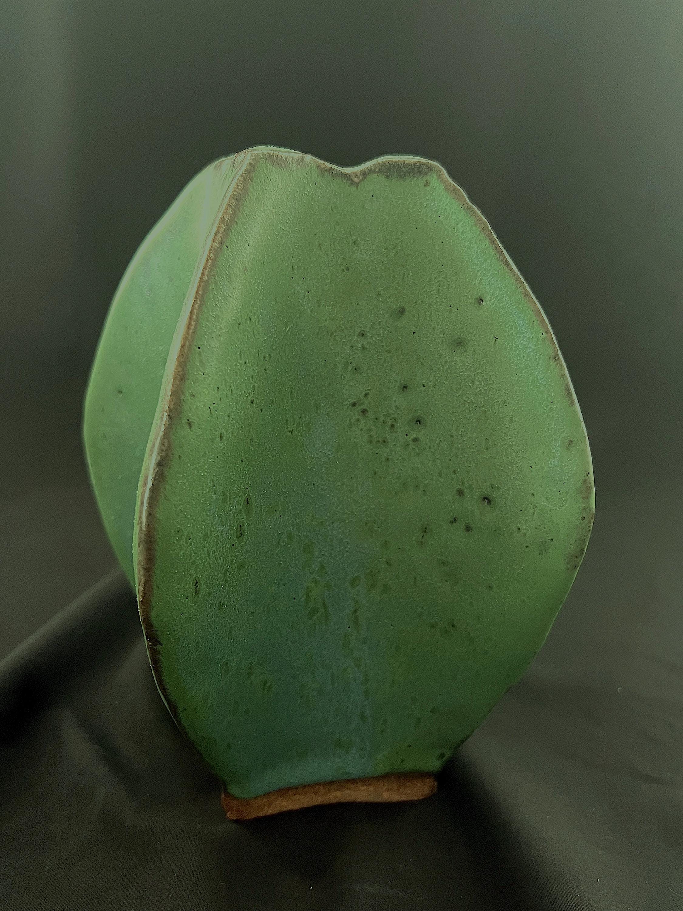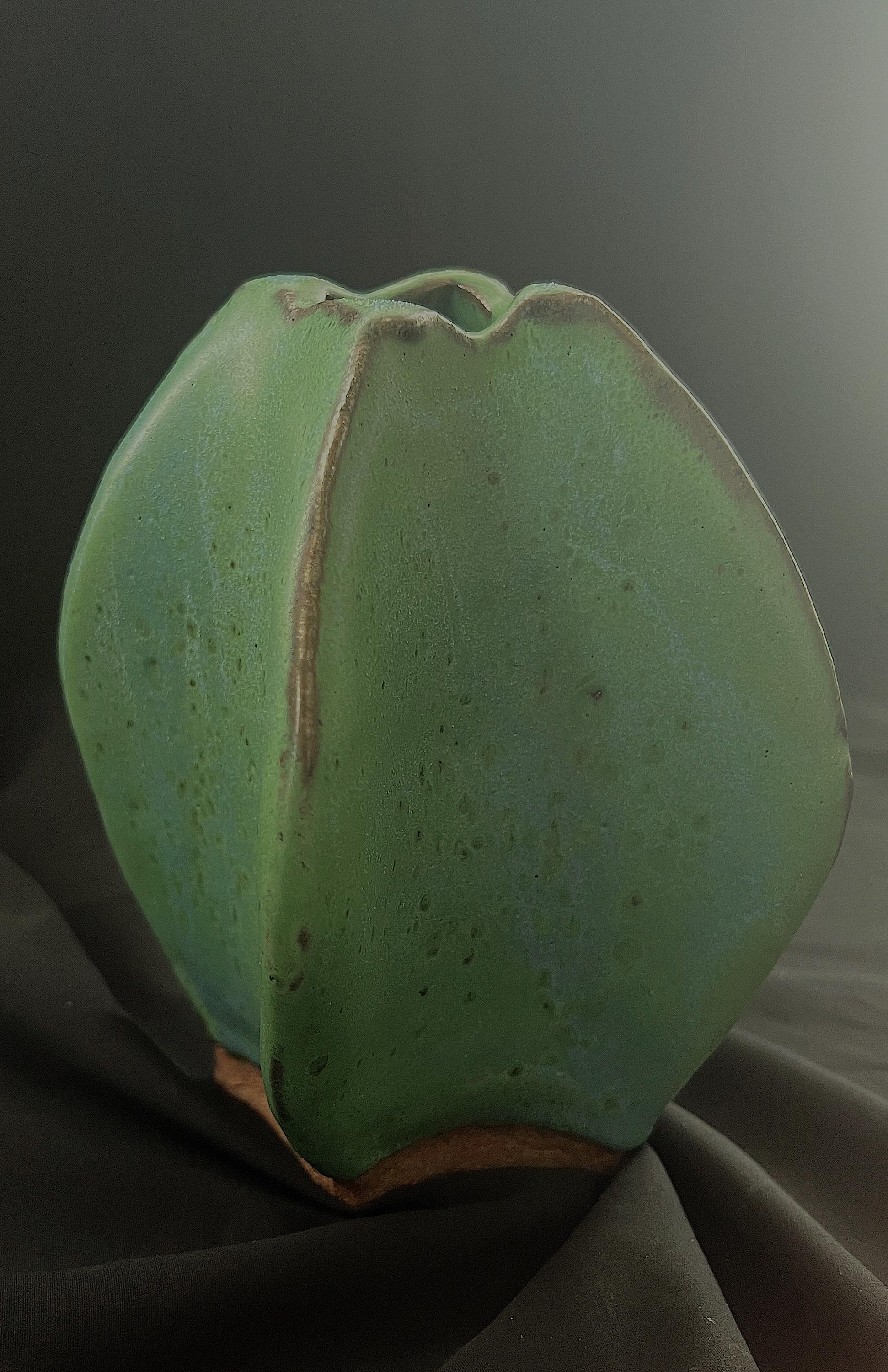 Rustic handmade pottery stoneware vase. Slab constructed. Reitz green glaze. Measures about 6 1/2 by 5 1/2 inches and is about 6 1/2 inches tall.